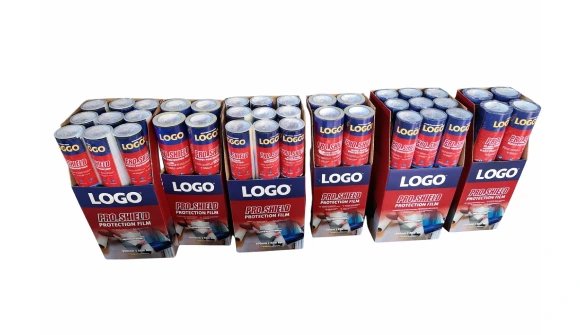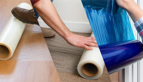 - PE film for carpet, hard floor, and glass/mirror surfaces — 1.5″ consumer-format cores, not 3″ industrial bulk rolls